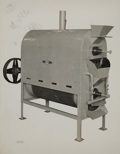 Printed on the front of photograph: '1220' Printed in black ink on back of photograph: 'Kerr / BROS. / COMMERCIAL / PHOTOGRAPHERS / 533 COLLINS ST. MELBOURNE' Printed in red ink on the back of photograph: 'PHOTO FILE NO / SECTION NO' Handwritten in black ink on the back of photograph: 'Peanut Roaster.' Handwritten in red pencil on the back of photograph: 'OFFICE Copy' Handwritten in grey pencil on the back of photograph: '18'