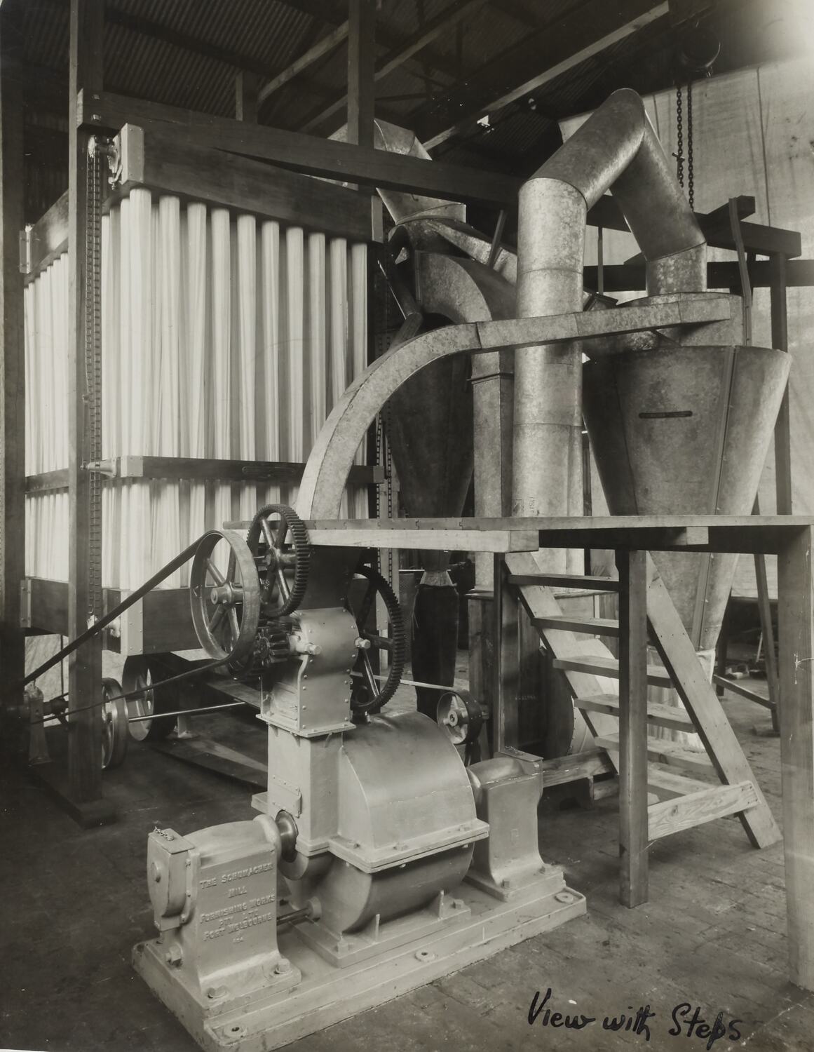 The Schumacher Mill Furnishing Works of Port Melbourne was established by the German-born American immigrant Otto Charles Schumacher around 1890. Operating initially under the name Otto C. Schumacher, the firm specialised in the importation, manufacture, installation and repair of flourmilling equipment, especially the newer style roller flour grinding machines, and associated equipment such as flour sifters, pollard and bran extractors, dust collectors, grain elevators and bag fillers. The business was formally registered as the Schumacher Mill Furnishing Works Pty Ltd in 1910. In later years the firm diversified into the manufacture of grain grading machinery for farmers and more general manufacturing equipment such as grinding mills, conveyors and packaging machinery.