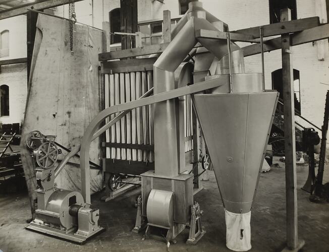 Black and white image depicting a grinding machine, filter and collector. It is part of a collection of photographs and marked printer's copy used in the preparation of trade literature promoting products manufactured by the Schumacher Mill Furnishing Works Pty Ltd. The items were originally housed in a wooden filing drawer, with many filed by subject. This photograph was previously filed under 'Pulverizer and Collector'.