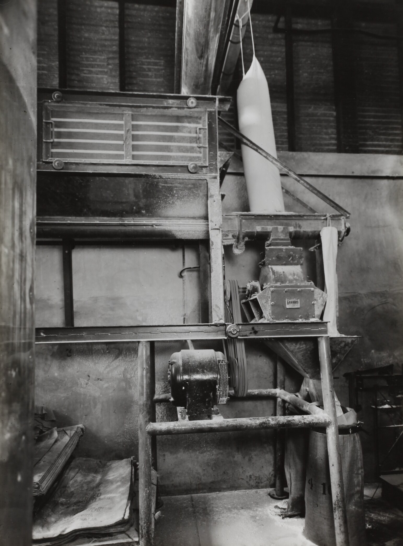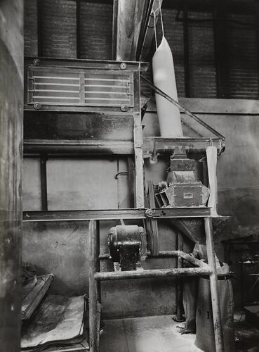 Black and white image depicting industrial machinery. It is part of a collection of photographs and marked printer's copy used in the preparation of trade literature promoting products manufactured by the Schumacher Mill Furnishing Works Pty Ltd. The items were originally housed in a wooden filing drawer, with many filed by subject. This photograph was previously filed under 'Milk Powder'.