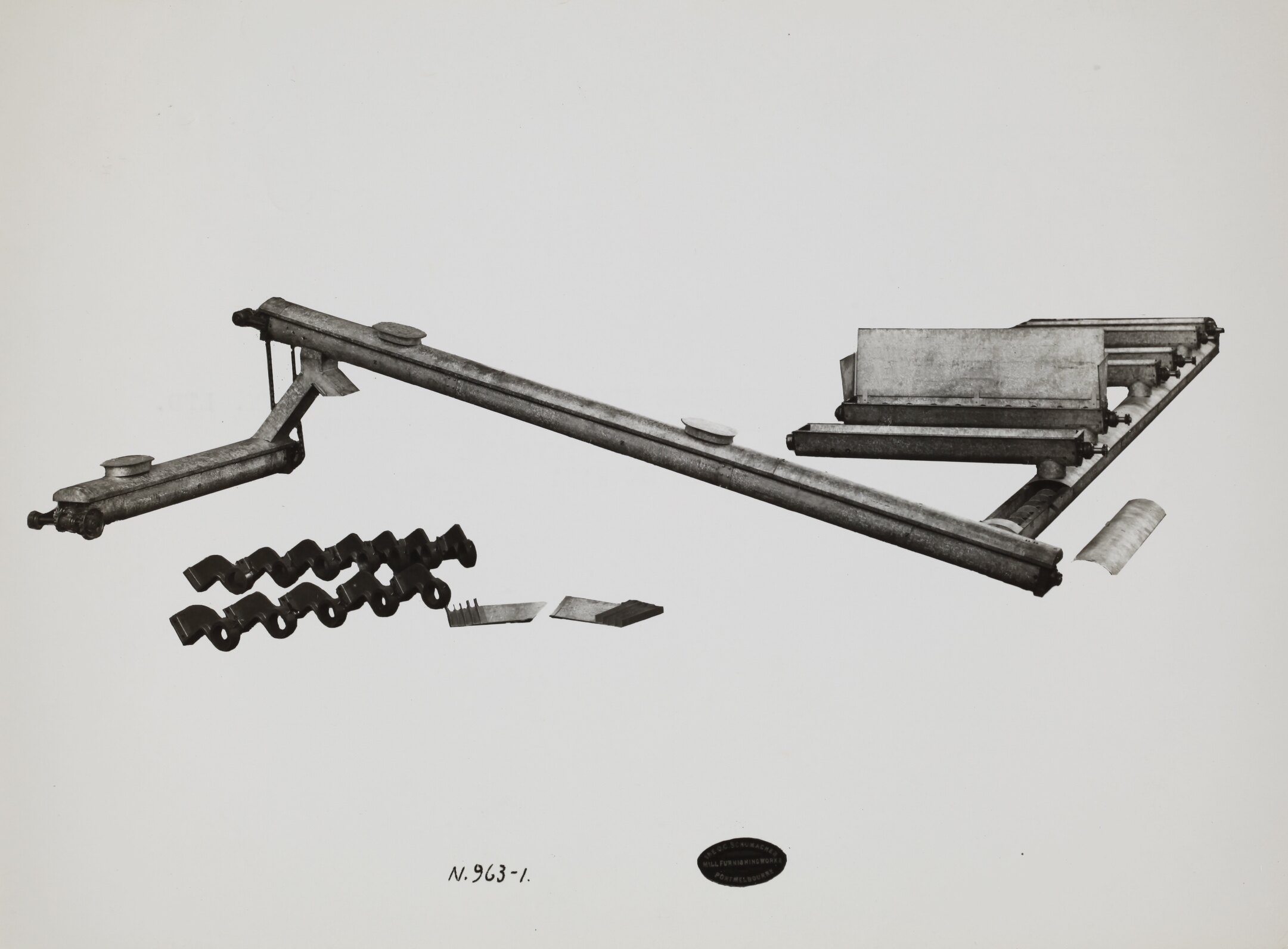 Black and white promotional image of a milk conveyor. It is part of a collection of photographs and marked printer's copy used in the preparation of trade literature promoting products manufactured by the Schumacher Mill Furnishing Works Pty Ltd. The items were originally housed in a wooden filing drawer, with many filed by subject. This photograph was previously filed under 'Milk Powder'.
