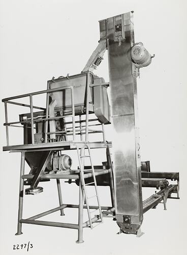 Black and white promotional image of a self contained plant used in the manufacture of milk powder. It is part of a collection of photographs and marked printer's copy used in the preparation of trade literature promoting products manufactured by the Schumacher Mill Furnishing Works Pty Ltd. The items were originally housed in a wooden filing drawer, with many filed by subject. This photograph was previously filed under 'Milk Powder'.