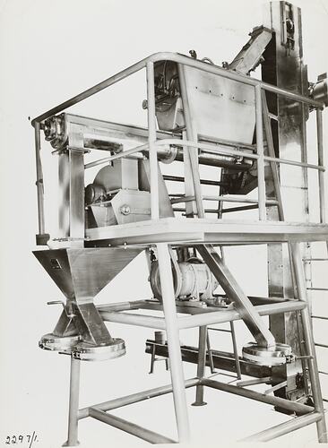 Black and white promotional image of a self contained plant used in the manufacture of milk powder. It is part of a collection of photographs and marked printer's copy used in the preparation of trade literature promoting products manufactured by the Schumacher Mill Furnishing Works Pty Ltd. The items were originally housed in a wooden filing drawer, with many filed by subject. This photograph was previously filed under 'Milk Powder'.