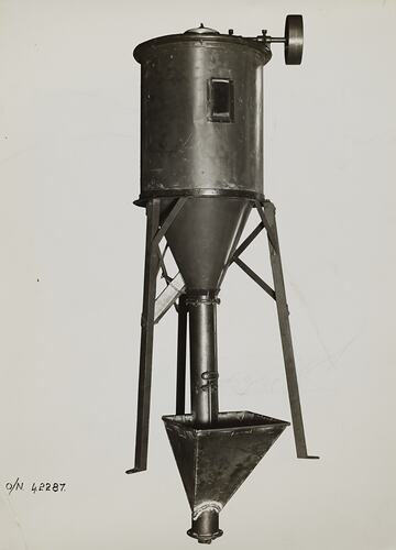 Printed in black on front of photograph: 'O/N. 42287.' Hand written in black ink on back of photograph: '"Geyser" type Mixer / with 2.HP Drive / Supplied to O.N. 42287 / dated 17.7.42' Printed in purple ink on back of photograph: 'K / 533 COLLINS ST' Printed in black ink on cream label attached to back of photograph: 'From / Schumacher Mill Furnishing Works / PROPRIETARY LIMITED. / PORT MELBOURNE, / VICTORIA.'