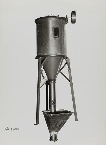 Black and white promotional image of a 'Geyser' type mixer. It is part of a collection of photographs and marked printer's copy used in the preparation of trade literature promoting products manufactured by the Schumacher Mill Furnishing Works Pty Ltd. The items were originally housed in a wooden filing drawer, with many filed by subject. This photograph was previously filed under 'Geyser'.
