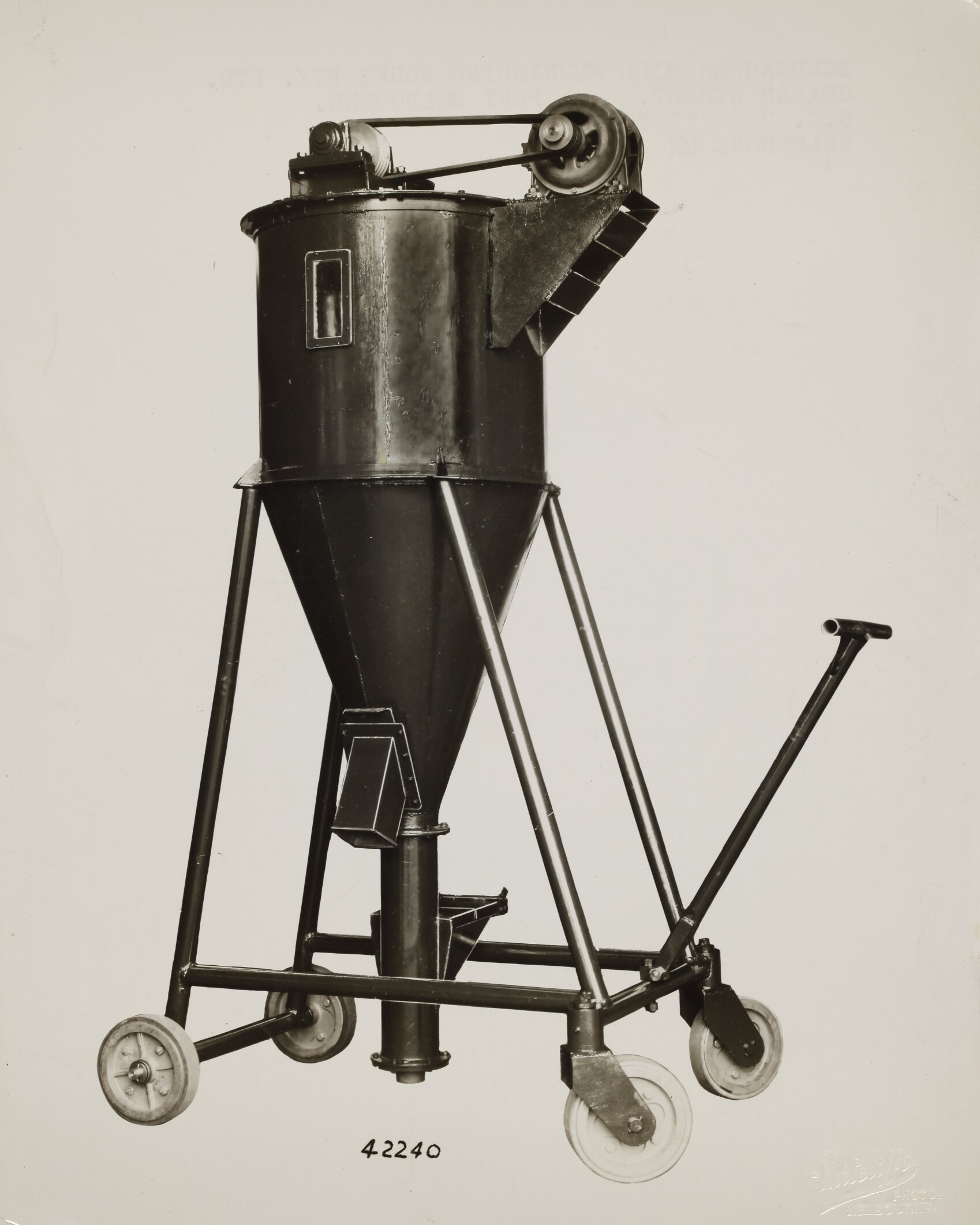 Printed in black on front of photograph: '42240' Printed in black ink on back of photograph: 'SCHUMACHER MILL FURNISHING WORKS PTY. LTD. / GRAHAM ST. PORT MELBOURNE. / S. C. 7 VICTORIA. / TELEPHONE MX 2171' Printed in red ink on back of photograph: 'MIXING EQUIPMENT' Printed in green ink on back of photograph: 'SUTCLIFFE PTY. LTD. / Commercial Photographers / 94 ELIZABETH STREET, MELBOURNE, / CENT. 1500.'