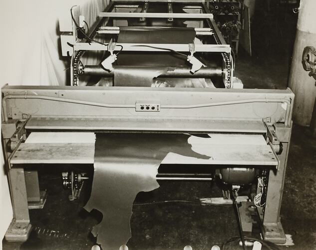 Black and white photograph depicting the interior of a tannery in Waukegan, Illinois, circa 1940s. It is part of a collection of photographs and marked printer's copy used in the preparation of trade literature promoting products manufactured by the Schumacher Mill Furnishing Works Pty Ltd. The items were originally housed in a wooden filing drawer, with many filed by subject. This photograph was previously filed under 'MISCELLANEOUS'.
