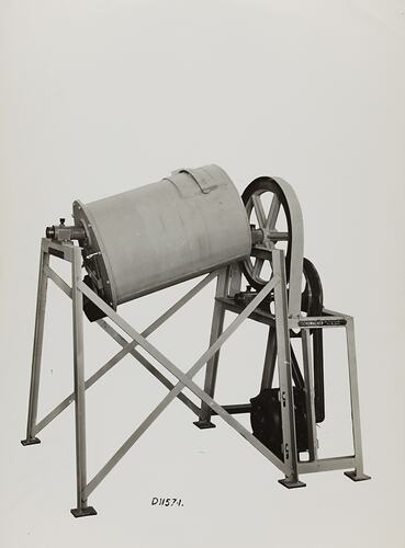 Black and white promotional image of drum type mixing equipment. It is part of a collection of photographs and marked printer's copy used in the preparation of trade literature promoting products manufactured by the Schumacher Mill Furnishing Works Pty Ltd. The items were originally housed in a wooden filing drawer, with many filed by subject. This photograph was previously filed under 'Rumbler'.