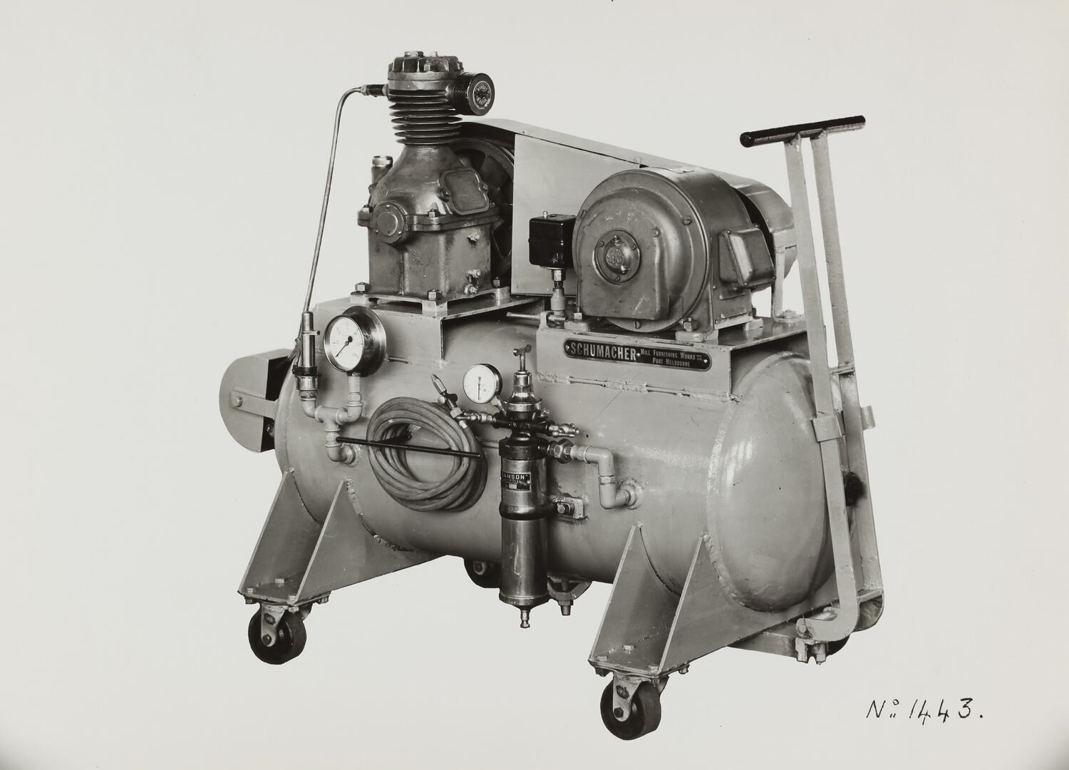 Printed on the front of photograph: 'No.1443.' Printed in black ink on back of photograph: 'Kerr / BROS. / COMMERCIAL / PHOTOGRAPHERS / 533 COLLINS ST. MELBOURNE / COMPRESSED AIR SPRAY UNIT EQUIPMENT, / SUPPLIED TO ORDER 47592.' Printed in red ink on back of photograph: 'OFFICE COPY.'