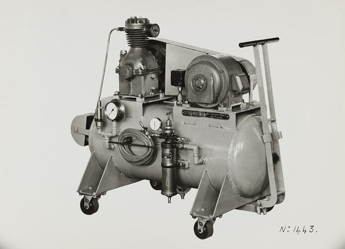 Black and white promotional image of compressed air spray unit equipment. It is part of a collection of photographs and marked printer's copy used in the preparation of trade literature promoting products manufactured by the Schumacher Mill Furnishing Works Pty Ltd. The items were originally housed in a wooden filing drawer, with many filed by subject. This photograph was previously filed under 'PORTABLE COMPRESSOR'.