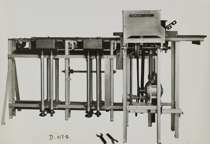 Printed on the front of photograph: 'D.1117.2' Printed in black ink on back of photograph: 'Kerr / BROS. / COMMERCIAL / PHOTOGRAPHERS / 533 COLLINS ST. MELBOURNE / COMPRESSED AIR SPRAY UNIT EQUIPMENT, / SUPPLIED TO ORDER 47592.' Printed in red ink on back of photograph: 'SCHUMACHER MILL FURNISHING WORKS PTY. LTD.' Printed in red ink on back of photograph: 'PHOTO FILE NO. / SECTION NO.' Handwritten in red pencil on the back of photograph: 'OFFICE / COPY' Handwritten in grey pencil on the back of photograph: '14' Handwritten in black pencil on the back of photograph: 'Ref. Or. No. 39184 dated 8-1-40'