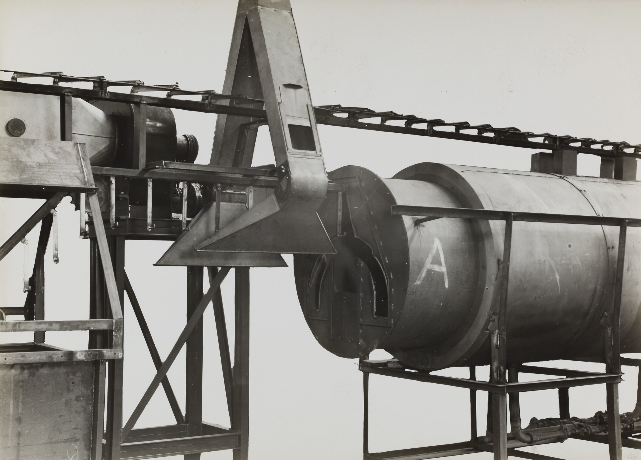 Black and white promotional image of a machine. It is part of a collection of photographs and marked printer's copy used in the preparation of trade literature promoting products manufactured by the Schumacher Mill Furnishing Works Pty Ltd. The items were originally housed in a wooden filing drawer, with many filed by subject. This photograph was previously filed under 'Laquer Dipping'.