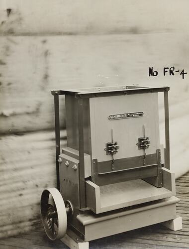 Handwritten in black ink on the front of photograph: 'No. FR-4' Printed in purple ink on back of photograph: 'Commercial / Photographers / Kerr / BROS. / 533 COLLINS ST. MELB.' Printed in red ink on back of photograph: 'PHOTO FILE NO. / SECTION NO.' Handwritten in grey pencil on the back of photograph: '4 / 7' Handwritten in red pencil on the back of photograph: 'OFFICE / COPY' Handwritten in blue ink on the back of photograph: 'der No. 27301. / 29/9/1928. Mt Lyell Chemical Works / Yarraville. / Feeder for ground rock (84lbs. cub. ft.) / apacity 6cm in 1 1/2" minutes, single delivery 24" wide, / 1/2" stroke, with slide ocer 5" opening, depth of box / 5".'