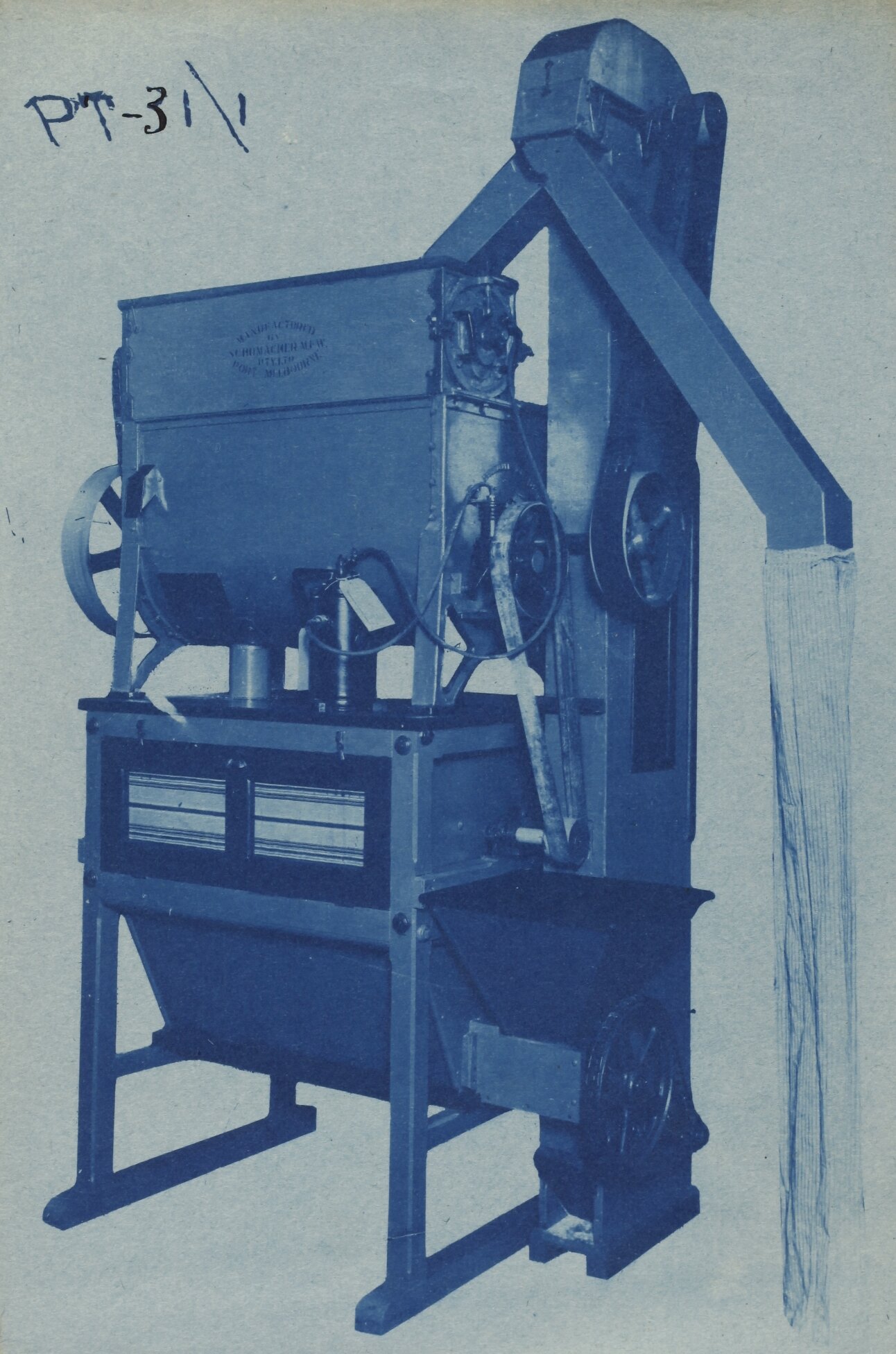 Cyanotype promotional image of a mixing and sifting machine. It is part of a collection of photographs and marked printer's copy used in the preparation of trade literature promoting products manufactured by the Schumacher Mill Furnishing Works Pty Ltd. The items were originally housed in a wooden filing drawer, with many filed by subject. This photograph was previously filed under 'Mixing, Sifting & Mixing & Sifting'.