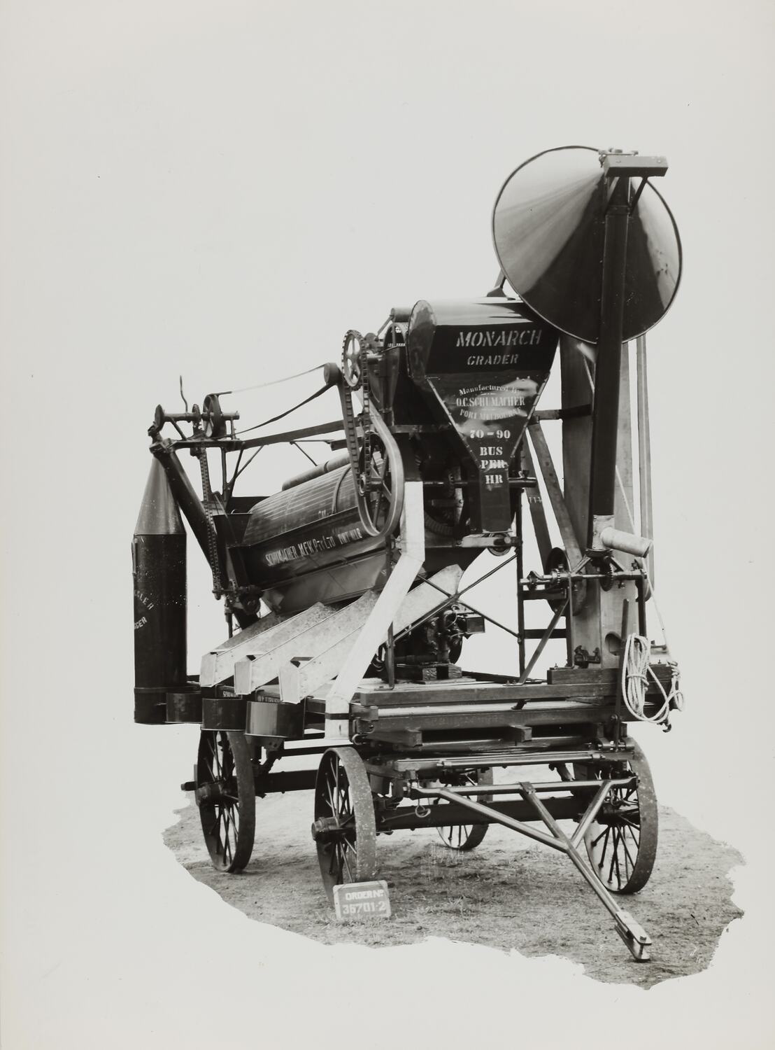 Black and white promotional image of a seed grading machine. It is part of a collection of photographs and marked printer's copy used in the preparation of trade literature promoting products manufactured by the Schumacher Mill Furnishing Works Pty Ltd. The items were originally housed in a wooden filing drawer, with many filed by subject. This photograph was previously filed under 'Seed Grading'.