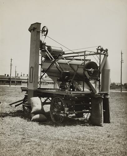 Black and white promotional image of a seed cleaning and grading machine. It is part of a collection of photographs and marked printer's copy used in the preparation of trade literature promoting products manufactured by the Schumacher Mill Furnishing Works Pty Ltd. The items were originally housed in a wooden filing drawer, with many filed by subject. This photograph was previously filed under 'Seed Grading'.