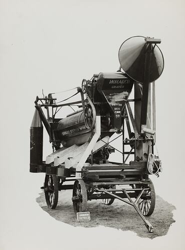 Black and white promotional image of a seed grading machine. It is part of a collection of photographs and marked printer's copy used in the preparation of trade literature promoting products manufactured by the Schumacher Mill Furnishing Works Pty Ltd. The items were originally housed in a wooden filing drawer, with many filed by subject. This photograph was previously filed under 'Seed Grading'.