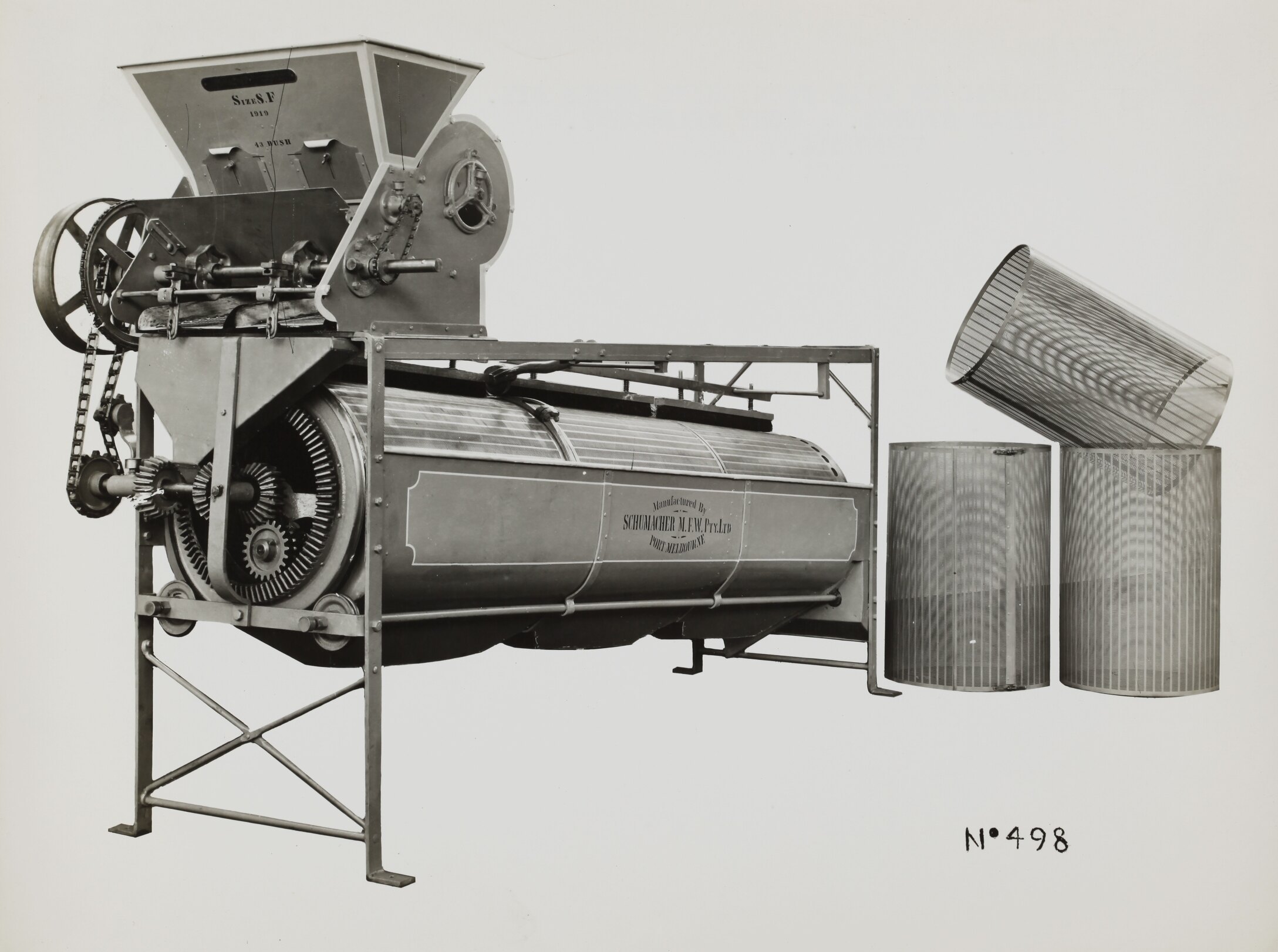 Black and white promotional image of a seed grading machine. It is part of a collection of photographs and marked printer's copy used in the preparation of trade literature promoting products manufactured by the Schumacher Mill Furnishing Works Pty Ltd. The items were originally housed in a wooden filing drawer, with many filed by subject. This photograph was previously filed under 'Seed Grading'.