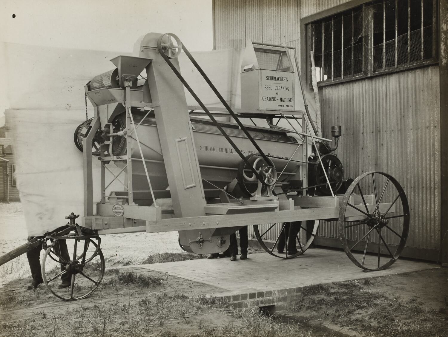 The Schumacher Mill Furnishing Works of Port Melbourne was established by the German-born American immigrant Otto Charles Schumacher around 1890. Operating initially under the name Otto C. Schumacher, the firm specialised in the importation, manufacture, installation and repair of flourmilling equipment, especially the newer style roller flour grinding machines, and associated equipment such as flour sifters, pollard and bran extractors, dust collectors, grain elevators and bag fillers. The business was formally registered as the Schumacher Mill Furnishing Works Pty Ltd in 1910. In later years the firm diversified into the manufacture of grain grading machinery for farmers and more general manufacturing equipment such as grinding mills, conveyors and packaging machinery.