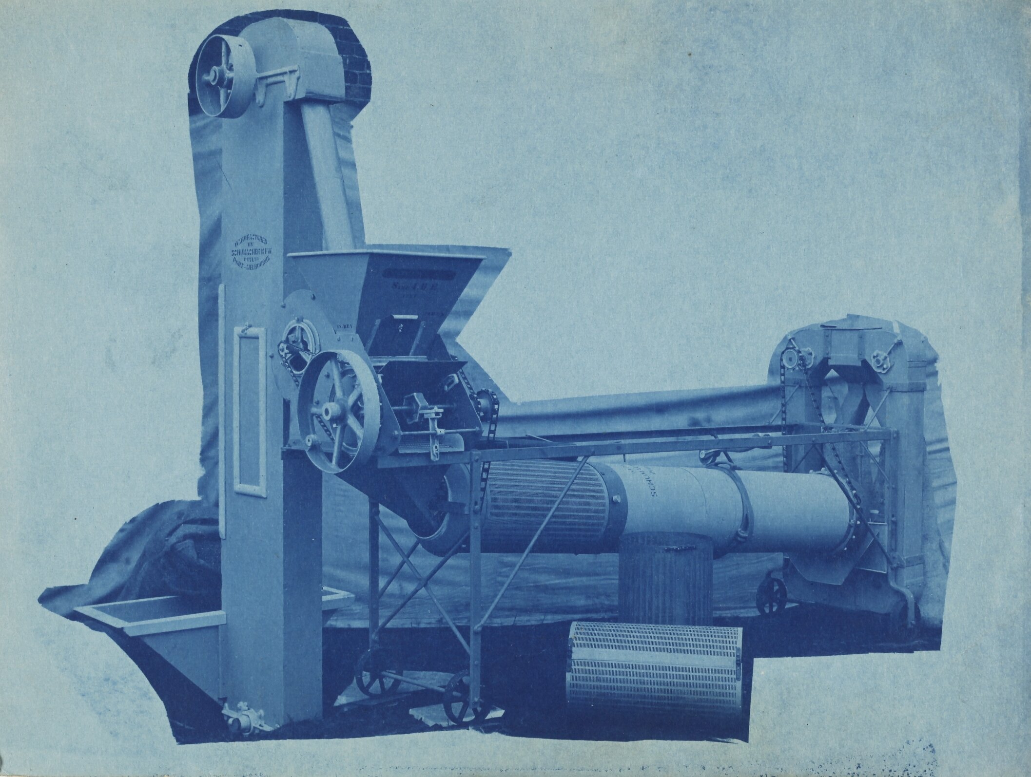 Cyanotype promotional image of a seed grading machine. It is part of a collection of photographs and marked printer's copy used in the preparation of trade literature promoting products manufactured by the Schumacher Mill Furnishing Works Pty Ltd. The items were originally housed in a wooden filing drawer, with many filed by subject. This photograph was previously filed under 'Seed Grading'.
