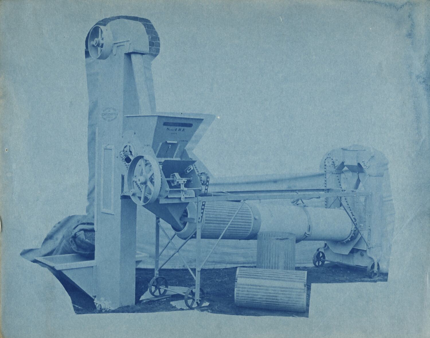 Cyanotype promotional image of a seed grading machine. It is part of a collection of photographs and marked printer's copy used in the preparation of trade literature promoting products manufactured by the Schumacher Mill Furnishing Works Pty Ltd. The items were originally housed in a wooden filing drawer, with many filed by subject. This photograph was previously filed under 'Seed Grading'.
