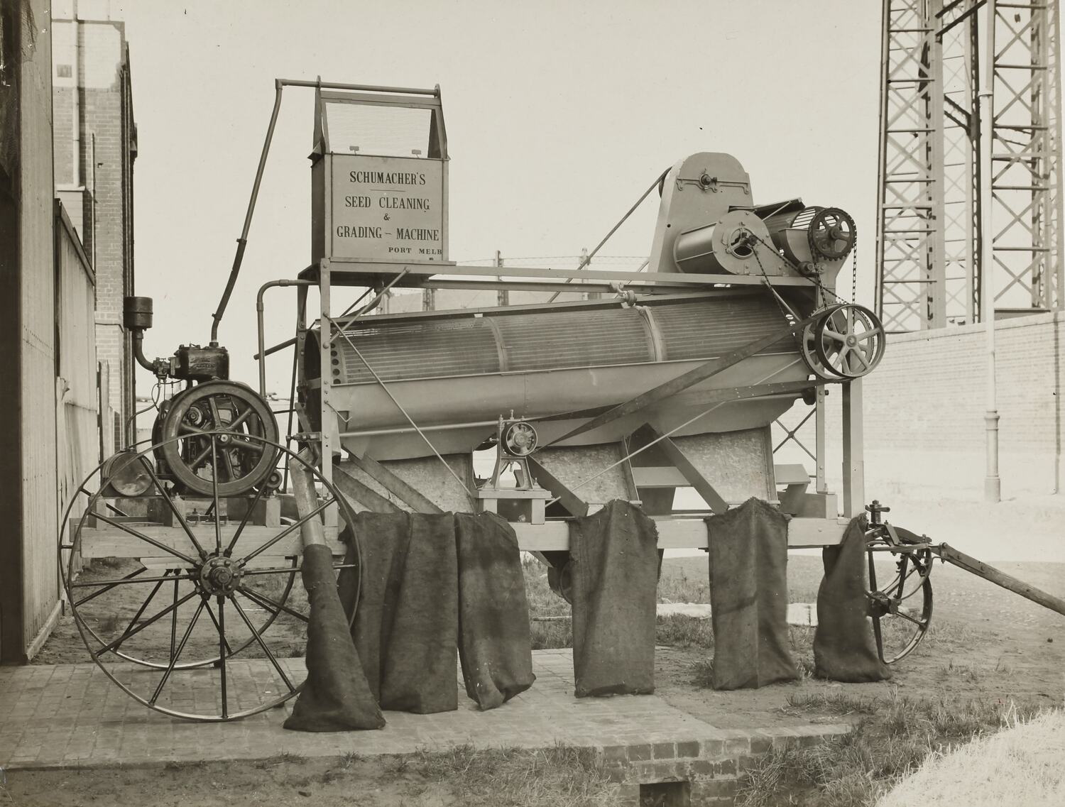 The Schumacher Mill Furnishing Works of Port Melbourne was established by the German-born American immigrant Otto Charles Schumacher around 1890. Operating initially under the name Otto C. Schumacher, the firm specialised in the importation, manufacture, installation and repair of flourmilling equipment, especially the newer style roller flour grinding machines, and associated equipment such as flour sifters, pollard and bran extractors, dust collectors, grain elevators and bag fillers. The business was formally registered as the Schumacher Mill Furnishing Works Pty Ltd in 1910. In later years the firm diversified into the manufacture of grain grading machinery for farmers and more general manufacturing equipment such as grinding mills, conveyors and packaging machinery.
