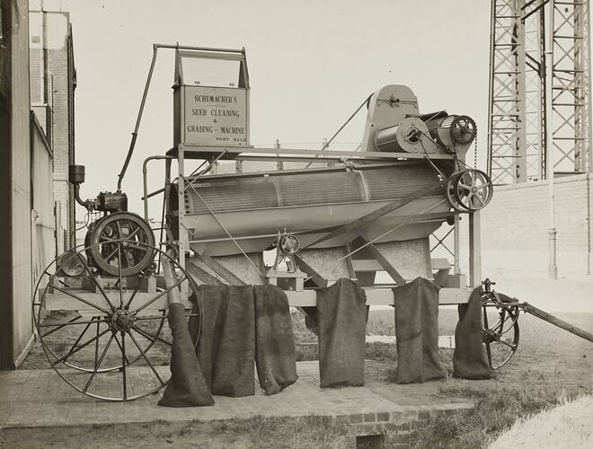 Black and white promotional image of a seed cleaning and grading machine. It is part of a collection of photographs and marked printer's copy used in the preparation of trade literature promoting products manufactured by the Schumacher Mill Furnishing Works Pty Ltd. The items were originally housed in a wooden filing drawer, with many filed by subject. This photograph was previously filed under 'Seed Grading'.