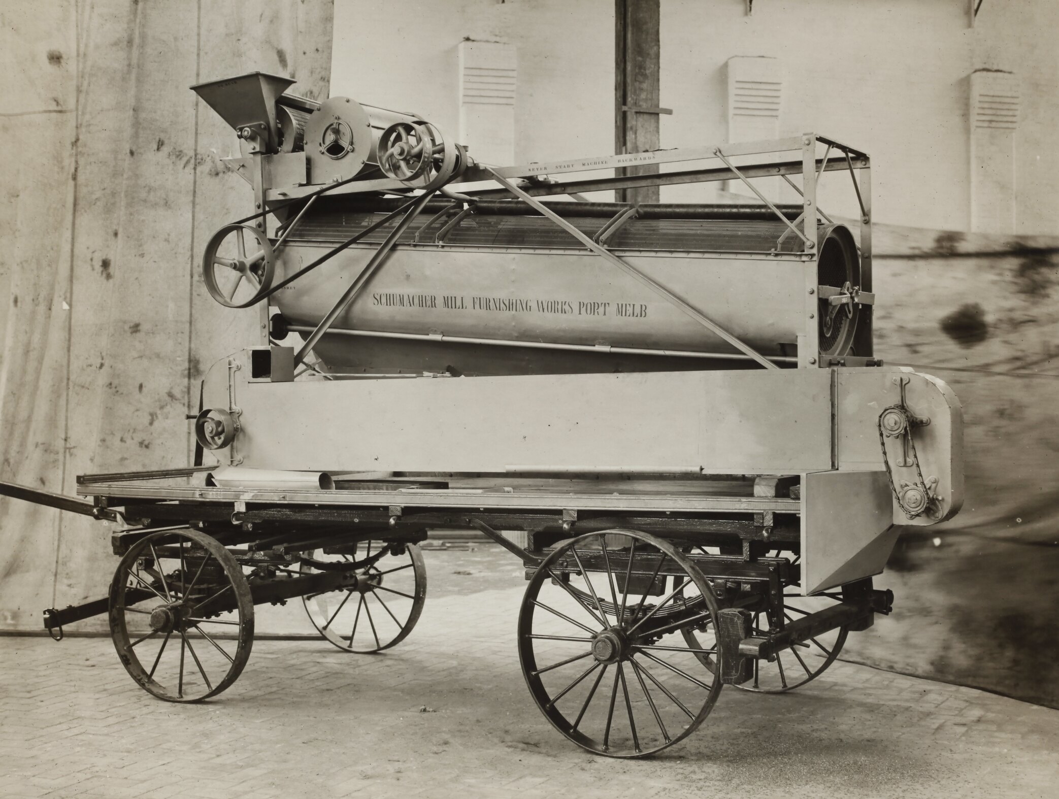 The Schumacher Mill Furnishing Works of Port Melbourne was established by the German-born American immigrant Otto Charles Schumacher around 1890. Operating initially under the name Otto C. Schumacher, the firm specialised in the importation, manufacture, installation and repair of flourmilling equipment, especially the newer style roller flour grinding machines, and associated equipment such as flour sifters, pollard and bran extractors, dust collectors, grain elevators and bag fillers. The business was formally registered as the Schumacher Mill Furnishing Works Pty Ltd in 1910. In later years the firm diversified into the manufacture of grain grading machinery for farmers and more general manufacturing equipment such as grinding mills, conveyors and packaging machinery.