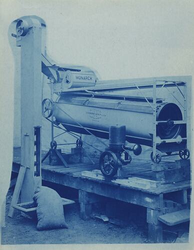 Cyanotype promotional image of a seed grading machine. It is part of a collection of photographs and marked printer's copy used in the preparation of trade literature promoting products manufactured by the Schumacher Mill Furnishing Works Pty Ltd. The items were originally housed in a wooden filing drawer, with many filed by subject. This photograph was previously filed under 'Seed Grading'.