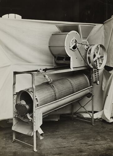 Black and white promotional image of a seed grading machine. It is part of a collection of photographs and marked printer's copy used in the preparation of trade literature promoting products manufactured by the Schumacher Mill Furnishing Works Pty Ltd. The items were originally housed in a wooden filing drawer, with many filed by subject. This photograph was previously filed under 'Seed Grading'.