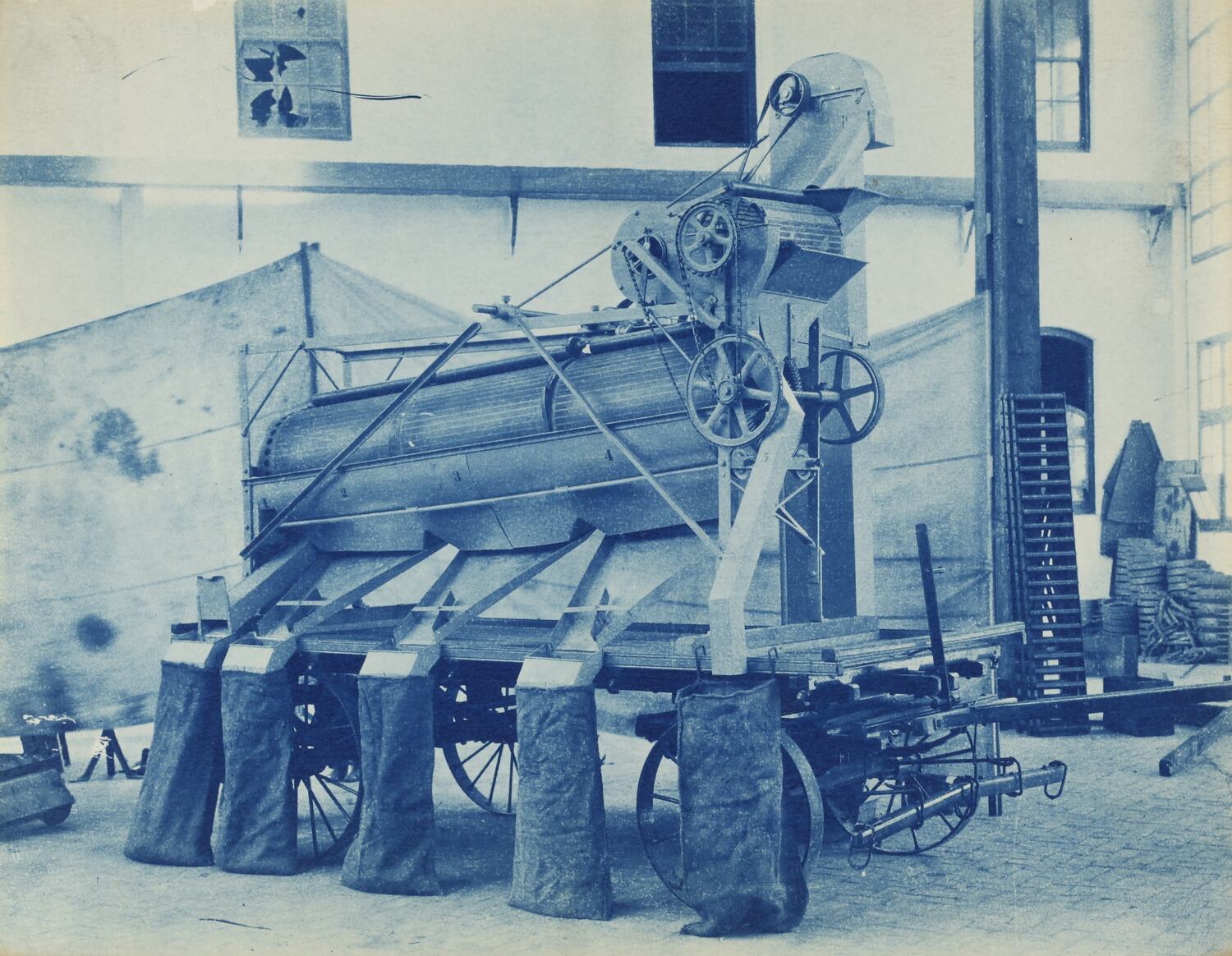 Cyanotype promotional image of a seed grading machine. It is part of a collection of photographs and marked printer's copy used in the preparation of trade literature promoting products manufactured by the Schumacher Mill Furnishing Works Pty Ltd. The items were originally housed in a wooden filing drawer, with many filed by subject. This photograph was previously filed under 'Seed Grading'.