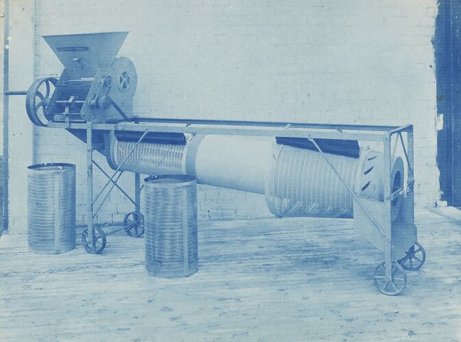 Cyanotype promotional image of a seed grading machine. It is part of a collection of photographs and marked printer's copy used in the preparation of trade literature promoting products manufactured by the Schumacher Mill Furnishing Works Pty Ltd. The items were originally housed in a wooden filing drawer, with many filed by subject. This photograph was previously filed under 'Seed Grading'.