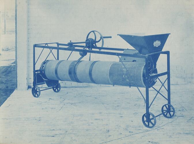 Cyanotype promotional image of a seed grading machine. It is part of a collection of photographs and marked printer's copy used in the preparation of trade literature promoting products manufactured by the Schumacher Mill Furnishing Works Pty Ltd. The items were originally housed in a wooden filing drawer, with many filed by subject. This photograph was previously filed under 'Seed Grading'.