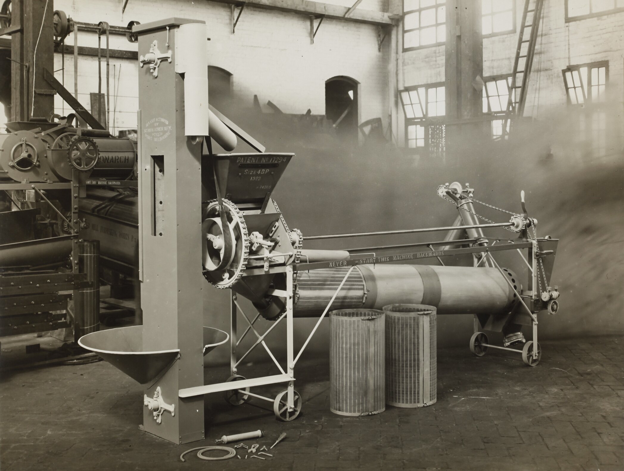 The Schumacher Mill Furnishing Works of Port Melbourne was established by the German-born American immigrant Otto Charles Schumacher around 1890. Operating initially under the name Otto C. Schumacher, the firm specialised in the importation, manufacture, installation and repair of flourmilling equipment, especially the newer style roller flour grinding machines, and associated equipment such as flour sifters, pollard and bran extractors, dust collectors, grain elevators and bag fillers. The business was formally registered as the Schumacher Mill Furnishing Works Pty Ltd in 1910. In later years the firm diversified into the manufacture of grain grading machinery for farmers and more general manufacturing equipment such as grinding mills, conveyors and packaging machinery.