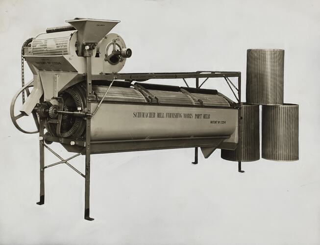 The Schumacher Mill Furnishing Works of Port Melbourne was established by the German-born American immigrant Otto Charles Schumacher around 1890. Operating initially under the name Otto C. Schumacher, the firm specialised in the importation, manufacture, installation and repair of flourmilling equipment, especially the newer style roller flour grinding machines, and associated equipment such as flour sifters, pollard and bran extractors, dust collectors, grain elevators and bag fillers. The business was formally registered as the Schumacher Mill Furnishing Works Pty Ltd in 1910. In later years the firm diversified into the manufacture of grain grading machinery for farmers and more general manufacturing equipment such as grinding mills, conveyors and packaging machinery.