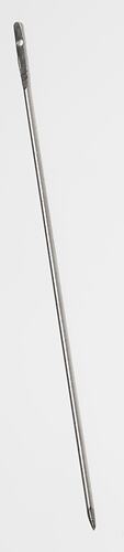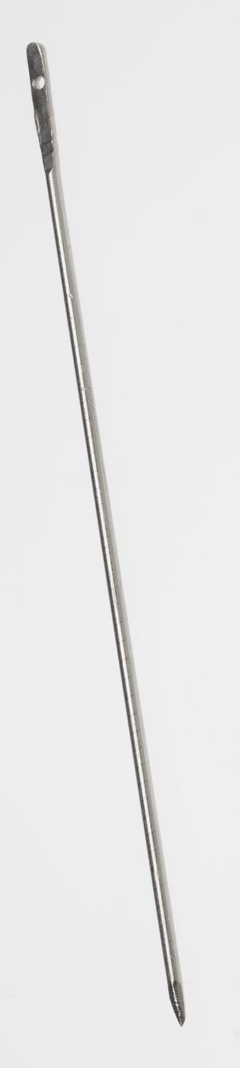 Metal needle with a flat head and single round eye.