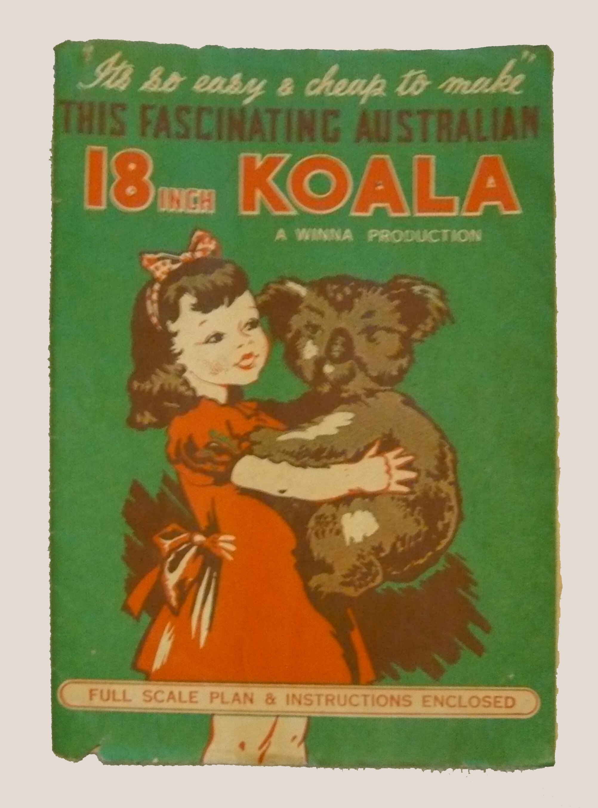 Printed on front cover of pamphlet: "It's so easy & cheap to make" / THIS FASCINATING AUSTRALIAN / 18 INCH KOALA / A WINNA PRODUCTION / FULL SCALE PLAN & INSTRUCTIONS ENCLOSED.