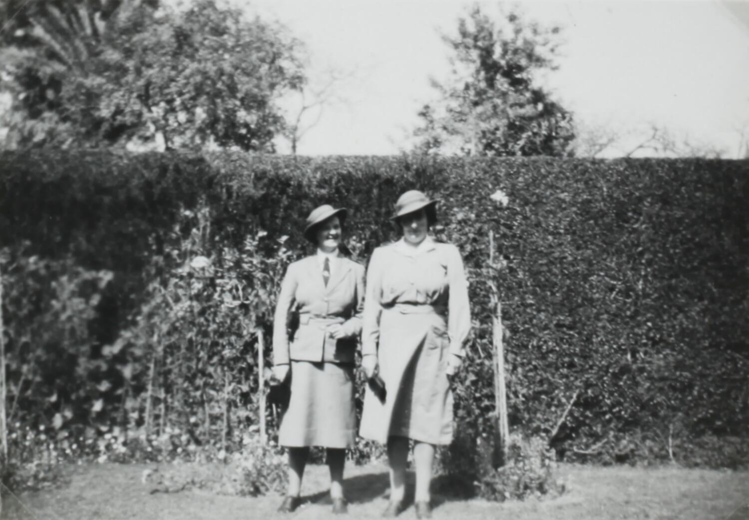 Portrait of two women in uniform, standing in a garden.