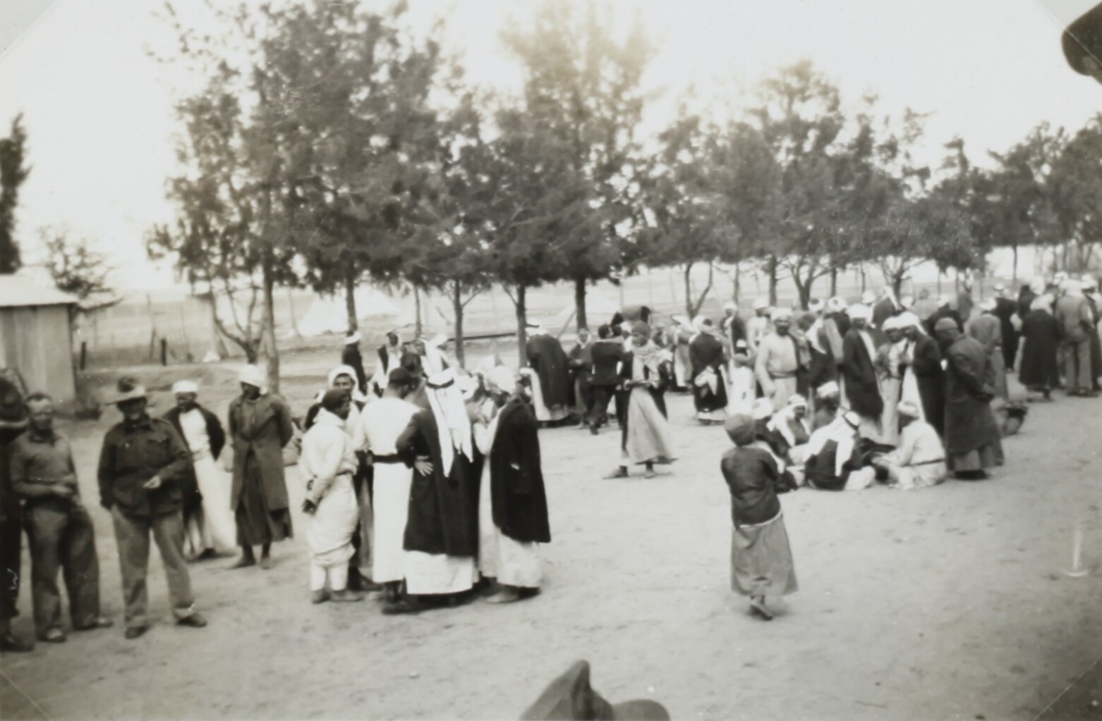 Streetscape showing groups of local men and children on a road in El Arish. Two men in military uniform are standing to the left.