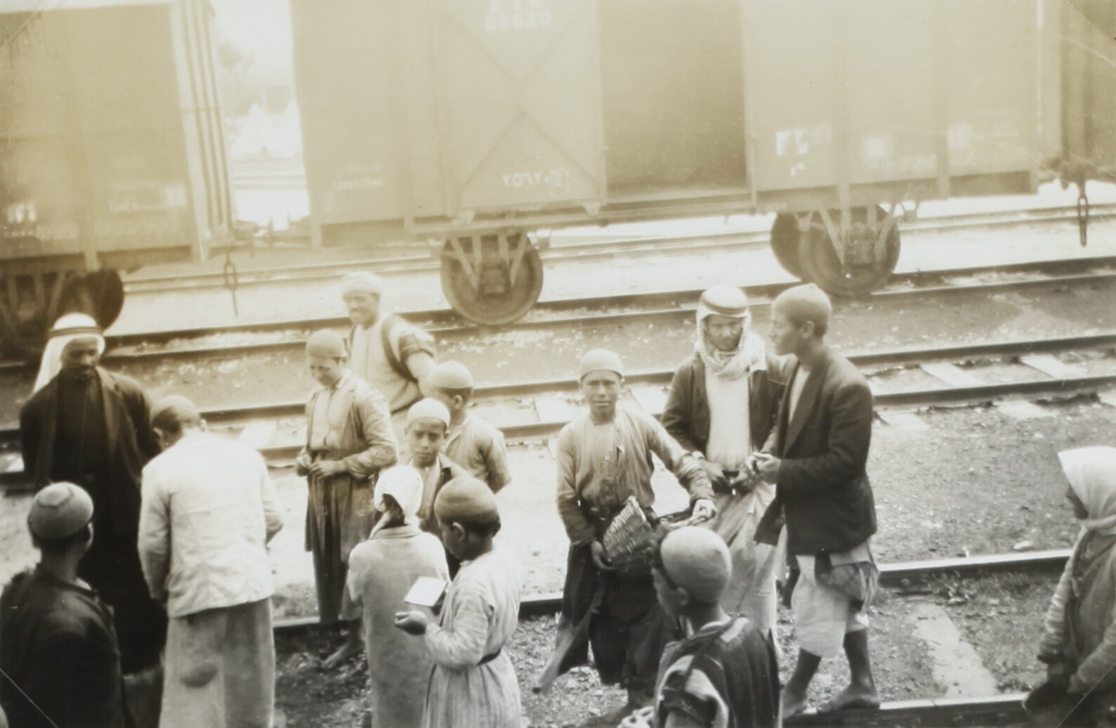 Group of local men and boys standing on railway tracks. Railway carriages are pictured in the background.