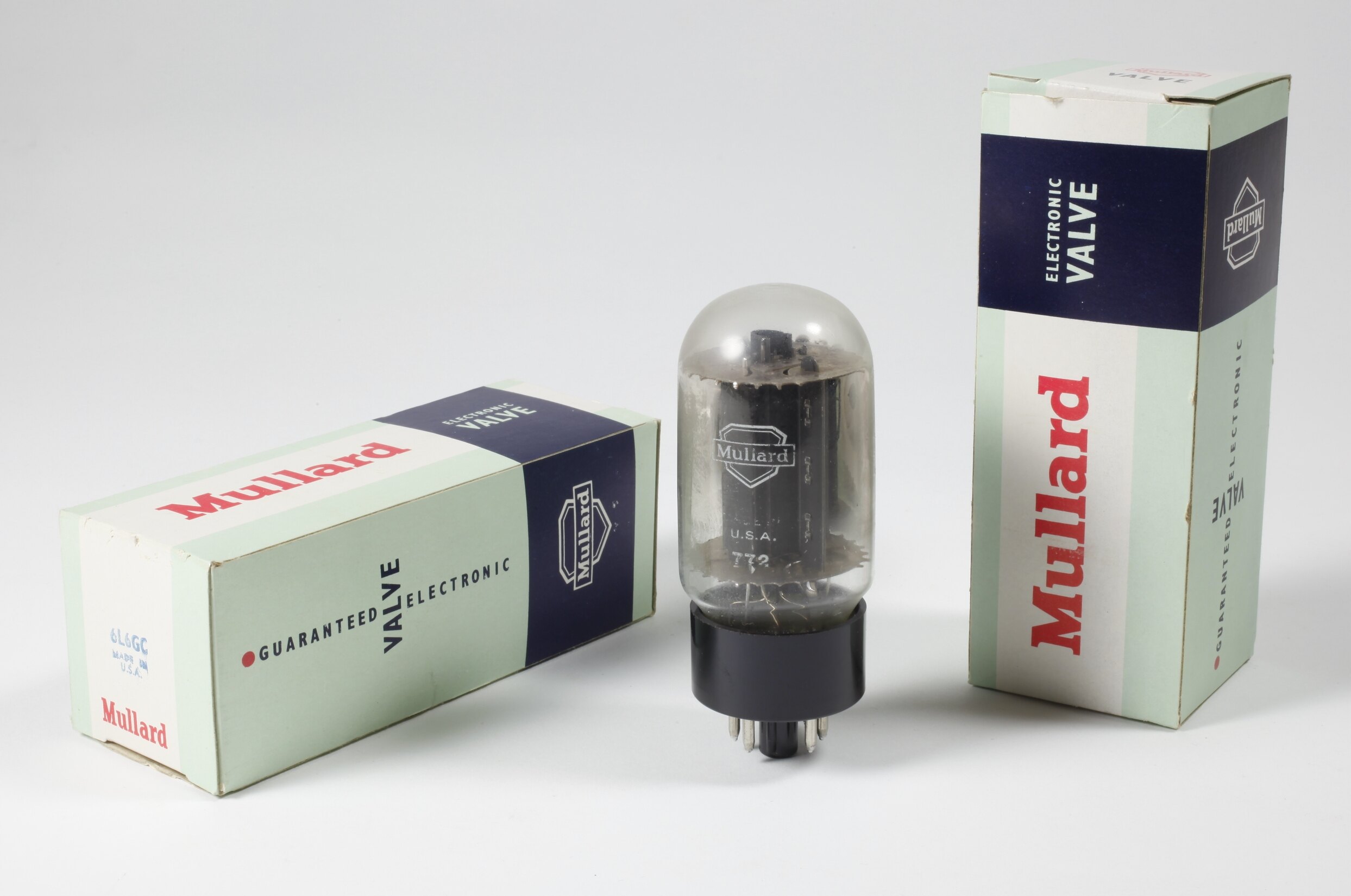 Two electronic valves (beam tetrode), Type 6L6GC, manufactured for Mullard in original packaging. Used as spare parts for the MUDPAC analogue computer. This valve most probably would have been used as a series regulator in a power supply.