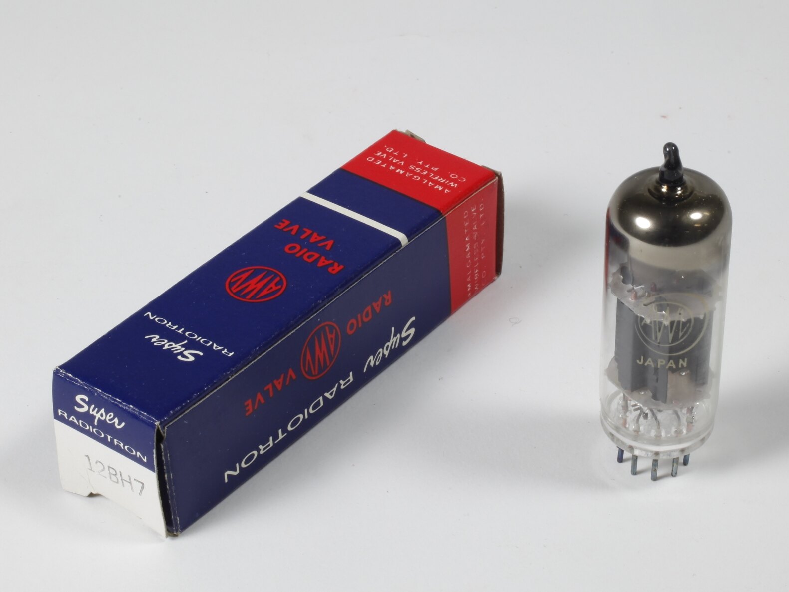 On bulb: ' AWV / JAPAN ', ' 12BH7A ' On box: ' Super / RADIOTRON / AWV / RADIO / VALVE / AMALGAMATED / WIRELESS VALVE / CO. PTY. LTD. ', ' Super / RADIOTRON / 12BH7 ' Inside box, printed: ' 69516 '