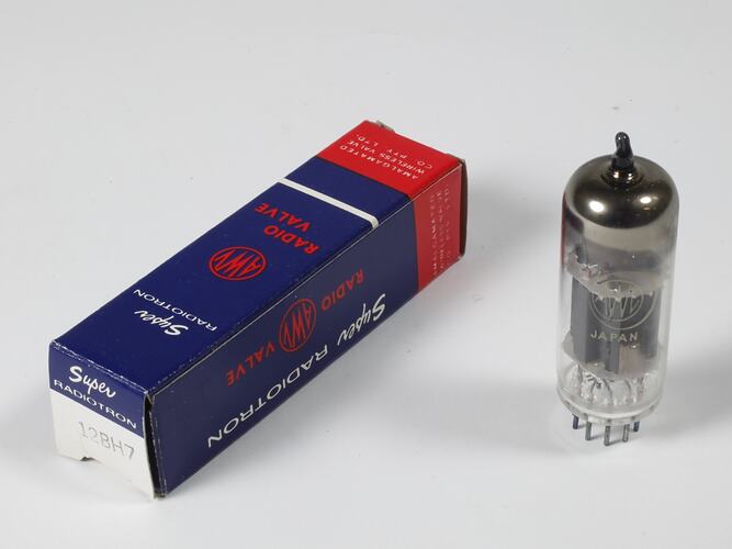 Electronic valve (twin triode), Type 12BH7, manufactured in Japan for Amalgamated Wireless Valve Co. Pty. Ltd, in original packaging. Used as spare part for the MUDPAC analogue computer. This valve was used in the third (output) stage of the operational amplifier modules.