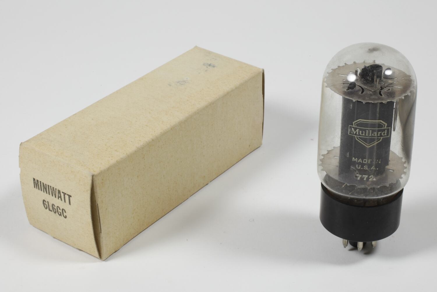 On bulb: ' Mullard / MADE IN / U.S.A. / 772 ', ' U.S.A. / 6L6 / GC ' On box: ' MINIWATT / 6L6GC ' , ' 32RI2 '
