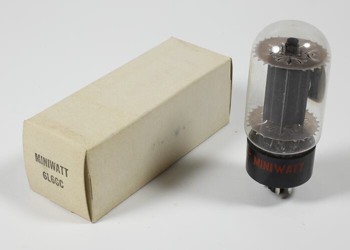 Electronic valve (beam tetrode), Type 6L6GC, manufactured by Miniwatt in original packaging. Used as a spare part for the MUDPAC analogue computer. This valve was used in the first (input) stage of the operational amplifier modules. The 5751 was a special quality valve designed for critical applications such as this.