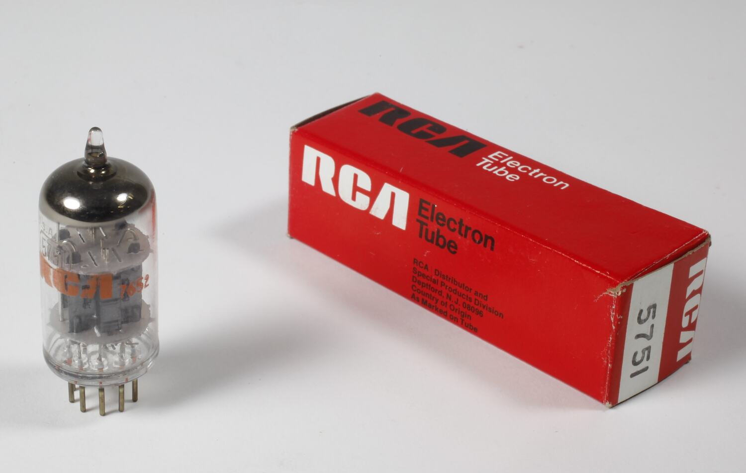 On bulb: ' U.S.A. / 5751 / RCA / 7652 ' On box: ' RCA Electron / Tube ', ' RCA / 5751 ', ' RCA: Distributor and / Special Products Division / Deptford, N.J. 08096 / Country of Origin / As Marked on Tube ' Inside box, on flap: ' 32R3-R / (6-75) '