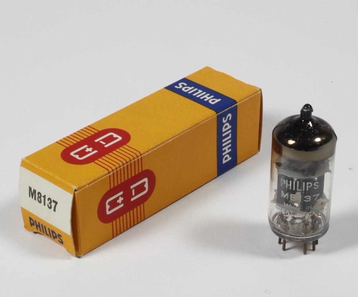 Electronic valve, Type M8137, manufactured by Mullard for Philips in original packaging. Used as a spare parts for the MUDPAC analogue computer. This valve was used in the second stage of the operational amplifier modules and in the integrator modules. It was a special quality valve, equivalent to the 12AX7 but with more tightly controlled characteristics.