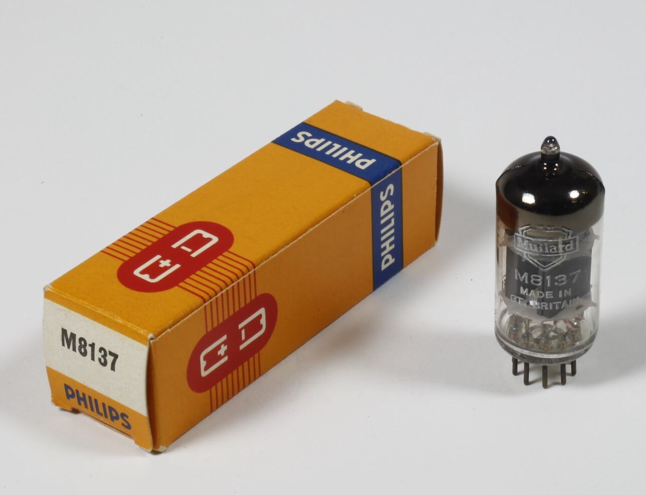 On bulb: ' Mullard / M8137 / MADE IN / GT. BRITAIN ', ' [broad arrow symbol] / YB / CV4004 / KB/D ' On box: ' PHILIPS ', ' M8137 '