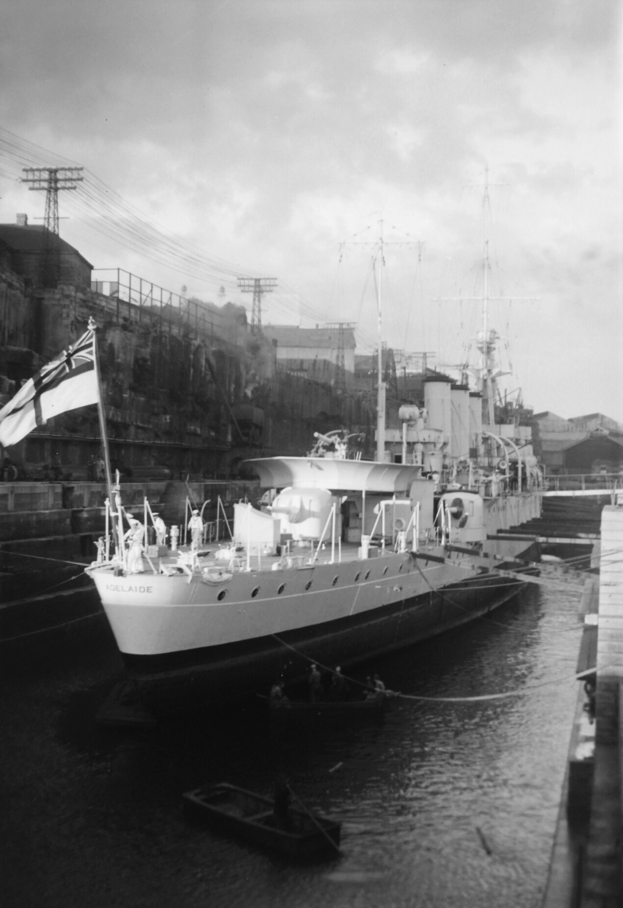 Royal Australian Navy light cruiser HMAS Adelaide docked at Cockatoo Island.