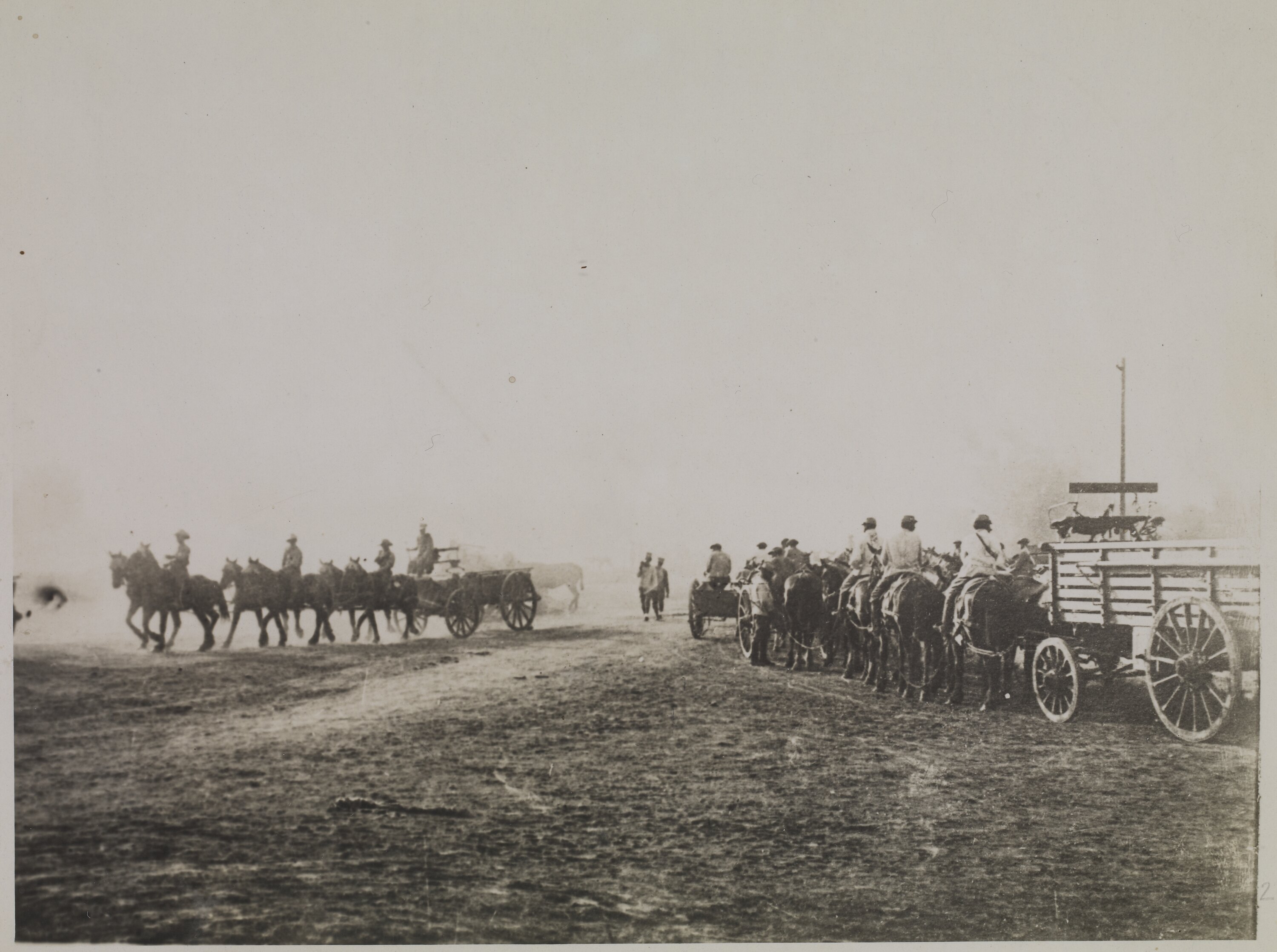 British and French forces in the Balkans transporting supplies with horse drawn vehicles during an advance against the Bulgarians.